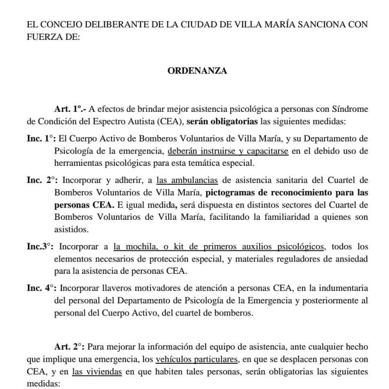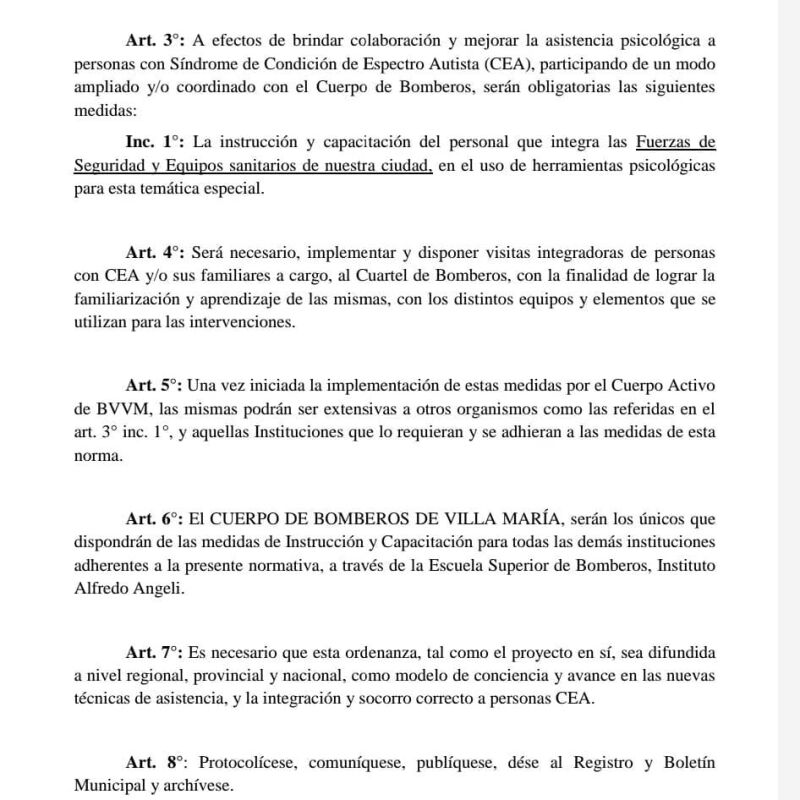 El Cuerpo de Bomberos Voluntarios de Villa María, comunicó el gran logro obtenido para dar una mejor asistencia psicológica a personas con Síndrome de Condición del Espectro Autista (CEA), a través de la sanción que el Concejo Deliberante de su ciudad, dio a la Ordenanza N° 7692.